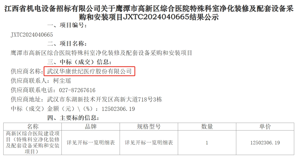 2025年2月15日,江西省鷹潭市高新區(qū)綜合醫(yī)院特殊科室凈化裝修及配套設(shè)備采購和安裝項目,經(jīng)公開招標(biāo),評標(biāo)委員會評審,并由有關(guān)行政監(jiān)督部門對開標(biāo)、評審工作全過程進(jìn)行監(jiān)督,現(xiàn)已公示我公司中標(biāo),中標(biāo)金額12502306.19元。